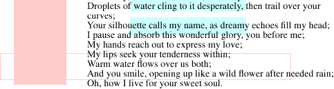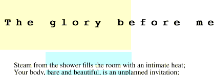 (RAW TEXT VERSION FOR CUT/PASTE) The glory before meBR>Droplets of water cling to it desperately, then trail over your curves; | ||