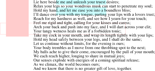 Back to Hericorte's Erotic Poetry Listing (index) Email me: [email protected] All poems, Copyright 2000, Paul Hericorte. All Rights Reserved. HOWEVER These poems are meant for enjoyment, and I give you full permission to use them in your private life. So if you wish, share them with a loved one or a friend. Please DO NOT steal them and attempt to publish the works as your own! To request a poetry reading, please send me an email. I do about ten a year - always ready for new adventures. |